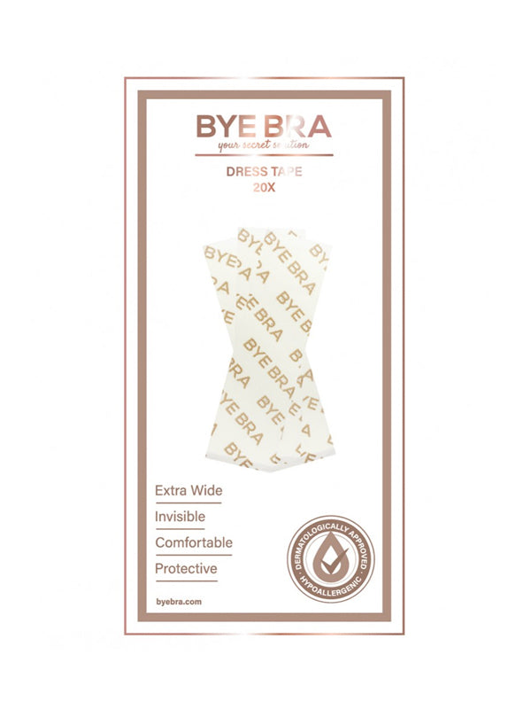 Banzile pentru îmbrăcăminte Bye Bra sunt discrete și confortabile. Cele 20 de benzi incluse sunt de 2.3 cm pe 8.2 cm, ceea ce le face mult mai late și mai lungi decât banzile obișnuite. Această caracteristică le face să reziste pe toată durata serii, în timp ce majoritatea produselor similare sunt prea subțiri pentru acest lucru. Adezivul 3M este de o calitate excepțională, dar delicat atât pe piele, cât și pe haine. Straturile de protecție dintre ele asigură că acestea nu se lipesc între ele înainte de utilizare.