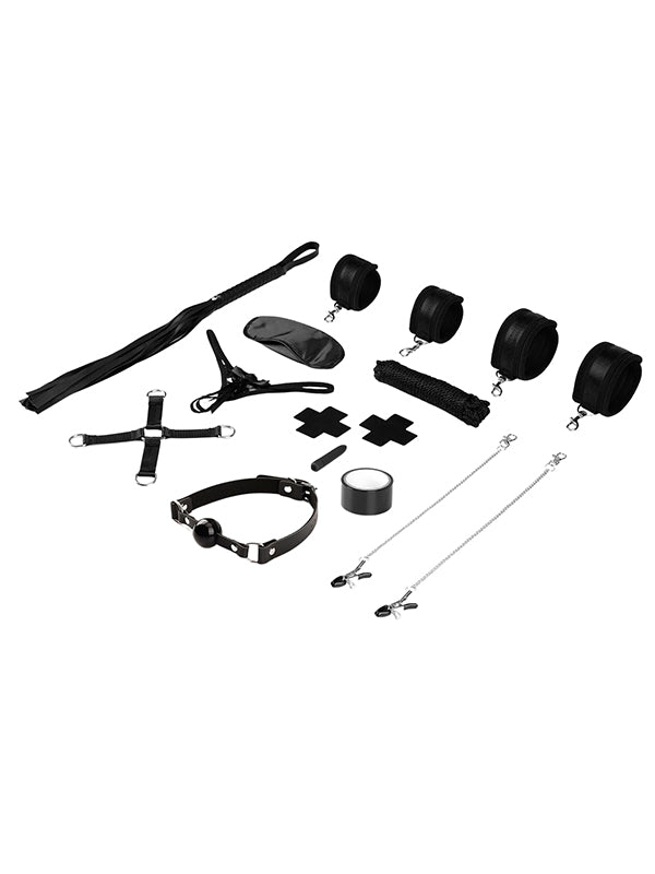 Setul include: Mască pentru ochi, căluș, manșete pentru mâini, manșete pentru glezne, hogtie, cleme pentru sfârcuri, autocolante pentru sfârcuri, flogger, bandă bondage, frânghie, mini vibrator și o pereche tanga.