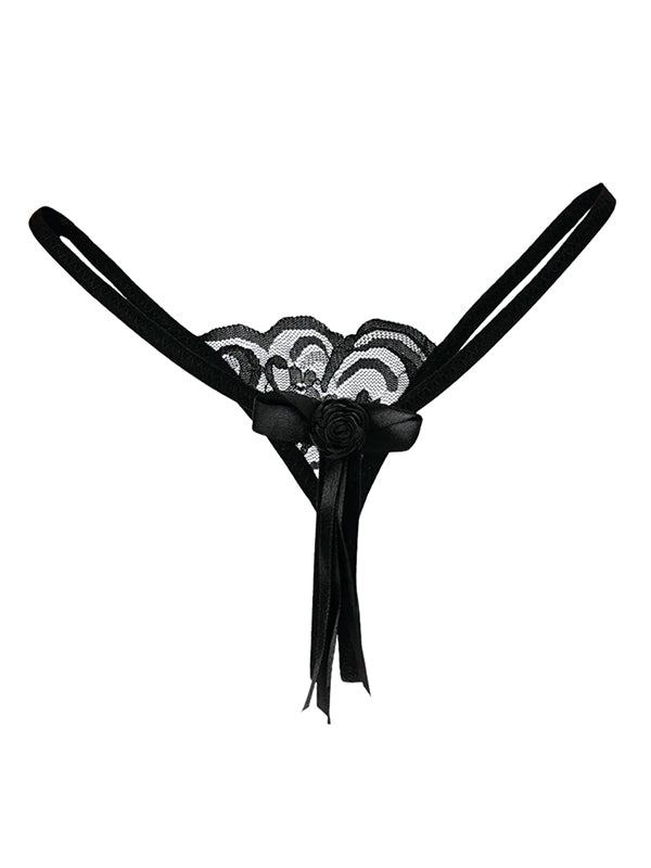 - Tanga negru de mărime unică cu dantelă în față și în spate, decorat cu o fundă