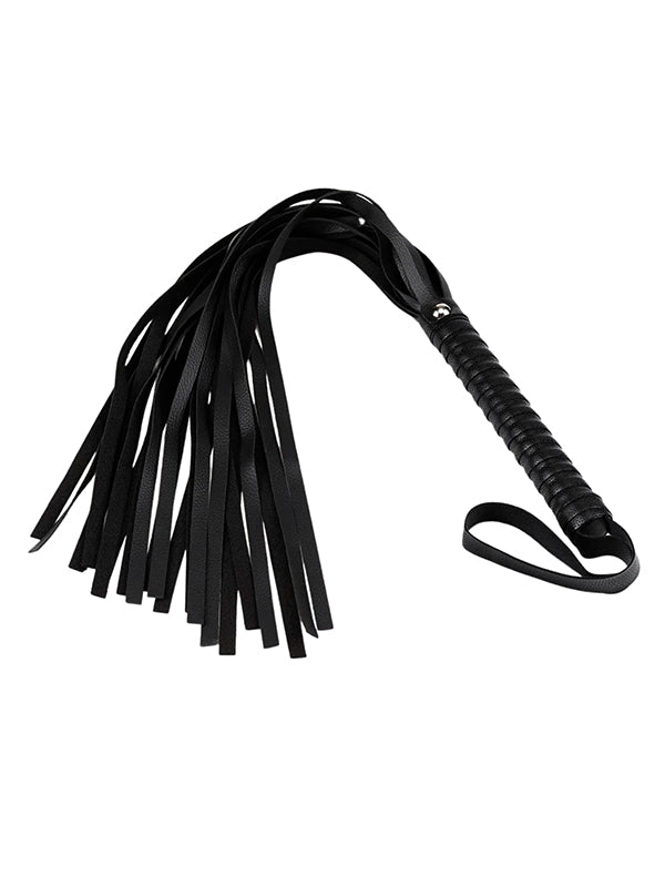 - Flogger din piele artificială cu mâner înfășurat și o buclă pentru încheietura mâinii (lungime totală: 54 cm; diametru mâner: 2.1 cm)