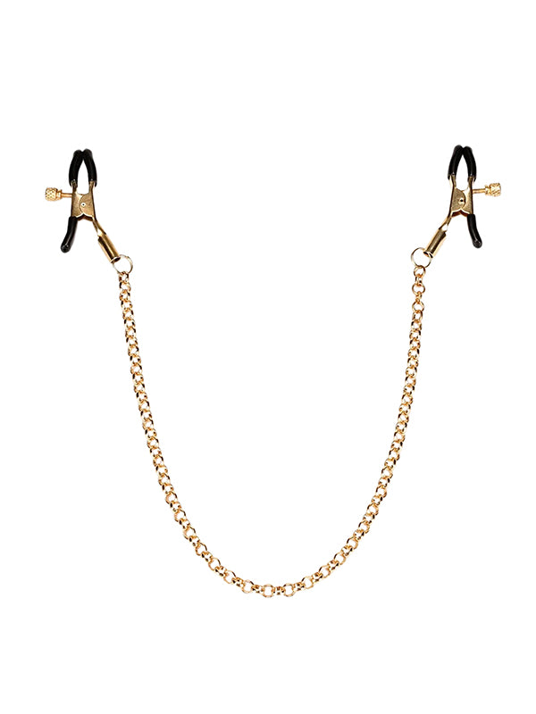 - Cleme aurii pentru sfârcuri cu vârfuri din cauciuc, șurub de presiune reglabil și conector de lanț (lungime totală: 48 cm)