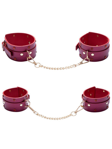 - Include: 1 x pereche de manșete pentru glezne, 1 x pereche de manșete pentru mâini, 1 x hogtie, 1 x choker (zgardă), 1 x lesă, 1 x căluș (Ø 4 cm), 1 x legătură pentru ochi