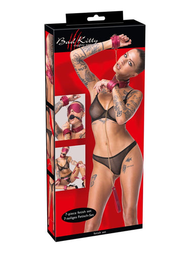 Răsfață-ți fanteziile cu rafinamentul seducător al setului bondage Bad Kitty format din 7 piese și creat pentru a combina eleganța cu jocurile erotice pline de pasiune. Realizat din piele ecologică roz, cu finisaj perlat lucios, acest set îmbină luxul cu senzualitatea. Accentele aurii, lanțurile strălucitoare și detaliile cu pietre rhinestone oferă un plus de glamour, transformând fiecare moment într-o experiență atât stilată cât și palpitantă.