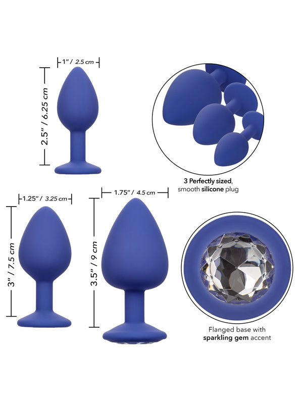 CalExotics Cheeky Gems este un set de antrenament anal plin de farmec, ce include 3 dopuri anale gradate cu o bază decorată cu o piatră prețioasă. Vă permite să creșteți în siguranță și confortabil nivelul de stimulare. Fiecare dop din set crește treptat în lungime și circumferință pentru o plăcere superbă la orice nivel de experiență.