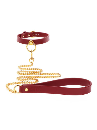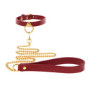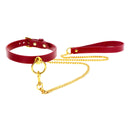 Chokerul din colecția TABOOM Bondage este fabricat din piele PU de un roșu intens și dispune de un inel tip O din metal auriu pentru a atașa lesa din lanț inclusă sau alte accesorii la alegere. Lesa are un mâner asortat din piele PU și se atașează la inelul O cu o încuietoare tip homar.