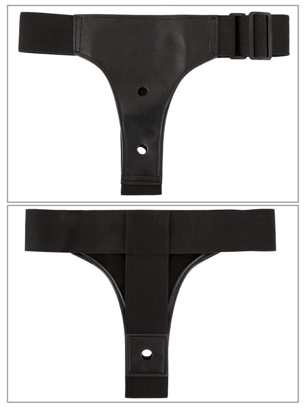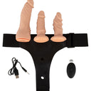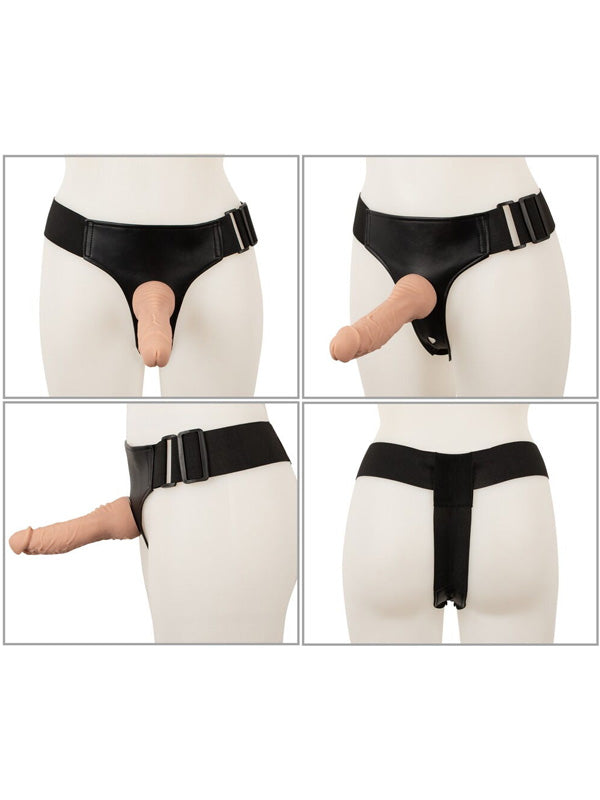 Hamul strap-on este realizat din piele artificială cu curele largi elastice și este reglabil în dimensiune, astfel încât totul să se potrivească strâns și confortabil. Vibratorul și dildourile sunt pur și simplu înșurubate în cele 3 deschideri ale hamului cu contraplacile lor după cum doriți.
