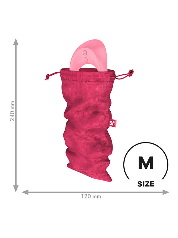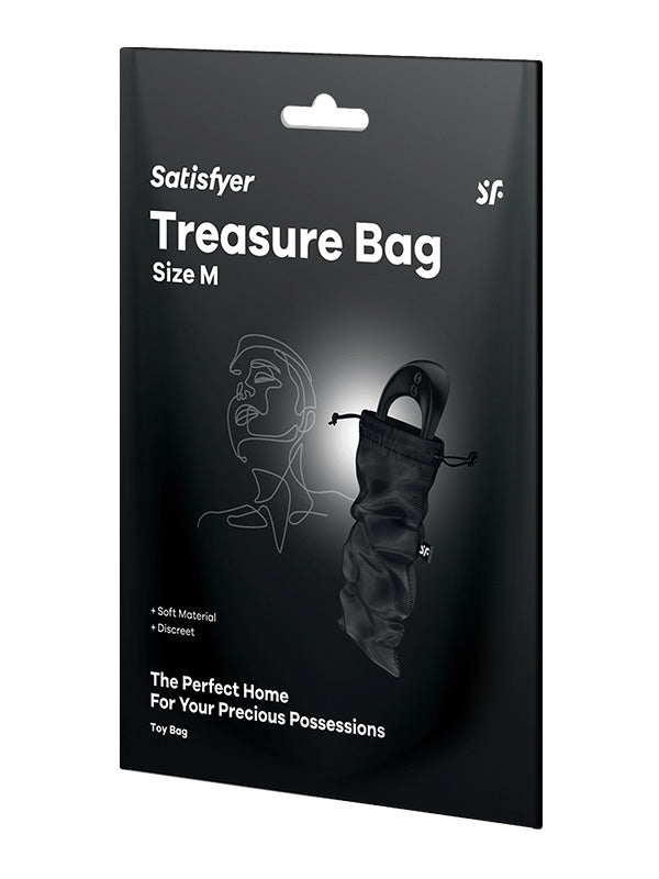 Fie că sunteți în căutarea unei modalități elegante de a vă depozita produsele sau doriți să luați jucăria preferată în călătorii și să o protejați de ochii curioșilor, Satisfyer Treasure Bags sunt exact ceea ce aveți nevoie! Confecționată dintr-un material moale și durabil, aceasta îți păstrează comorile în siguranță până când este timpul pentru următoarea aventură sexy. Marimea medie are dimensiunea perfectă pentru a-ți depozita comorile Satisfyer mici, cum ar fi lay-ons, dopurile anale sau bilele Kegel, într-un mod elegant și sigur.
