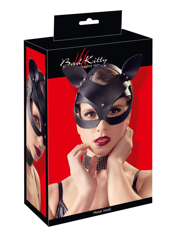 Mască Bad Kitty din imitație de piele cu urechi senzuale de pisică și decorată cu mici nituri din stras. Masca dispune de butoane închise prin presare și o cataramă de fixare la spate pentru o potrivire ideală. Perfectă pentru jocuri incitante de rol.