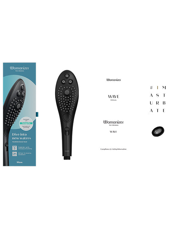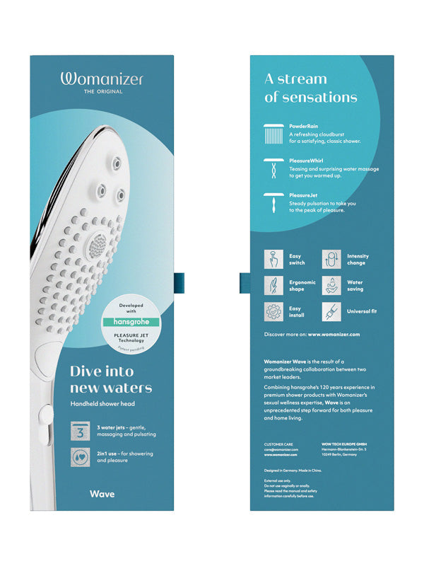 - Include: Cap de duș Womanizer Wave, garnitură pentru sită, ghid de pornire rapidă, informații de siguranță