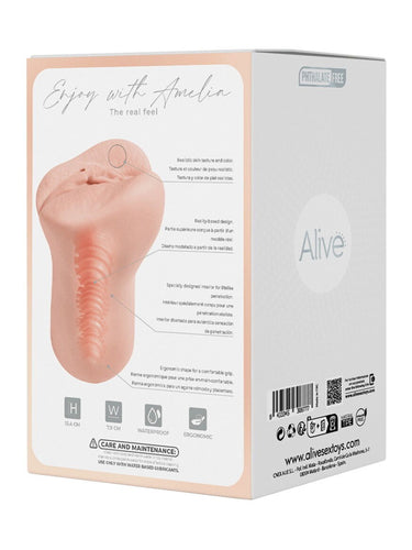 Alive Amelia este un masturbator realist fabricat din material TPE moale și catifelat, care îl face să arate și să se simtă exact ca piele reală. Interiorul său prezintă diverse texturi canelate care masează intens penisul. Ergonomic și ușor de manevrat, acesta se potrivește perfect în palma unei mâini și poate fi ușor strâns pentru senzații strâmte. Masturbatorul este deschis la celălalt capăt, ceea ce îl face ușor de curățat.