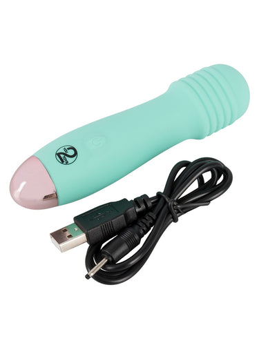 Mini vibratorul You2Toys din noua colecție Cuties este creat dintr-un silicon moale și mătăsos la atingere, de culoare verde pastel deschis. Capul canelat, texturat, oferă o stimulare suplimentară atunci când este introdus sau utilizat extern. Este mic, ușor de ținut și manevrat, perfect pentru a fi luat cu tine în călătorii. Vibratorul este impermeabil și gata de distracție în cadă sau în duș.