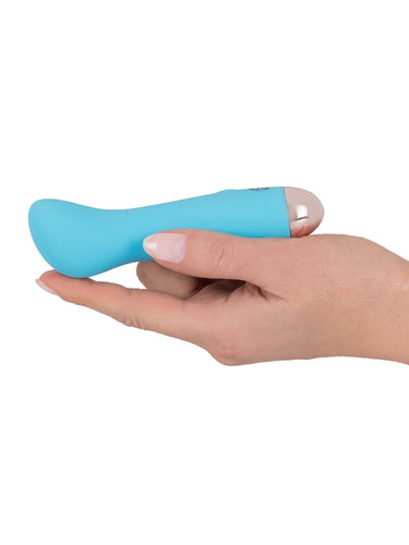 Mini vibratorul You2Toys G-spot din noua colecție Cuties este creat dintr-un silicon moale și mătăsos la atingere, într-o culoare superbă albastru pastel. Capul curbat permite o stimulare ușoară și de suprafață a punctului G atunci când este introdus. Este mic, ușor de ținut în mână și de manevrat. Perfect pentru fi luat cu tine în călătorii. Vibratorul este impermeabil și gata de distracție în cadă sau la duș.