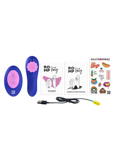 - Include: Vibrator Romp Party, Ghid de pornire rapidă, Instrucțiuni de siguranță, Autocolante, Cablu de încărcare USB