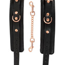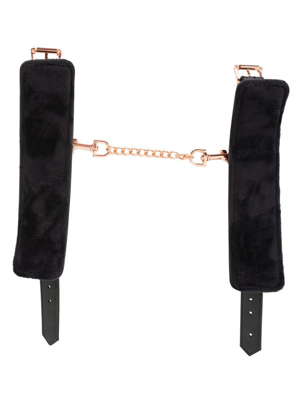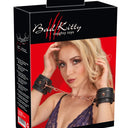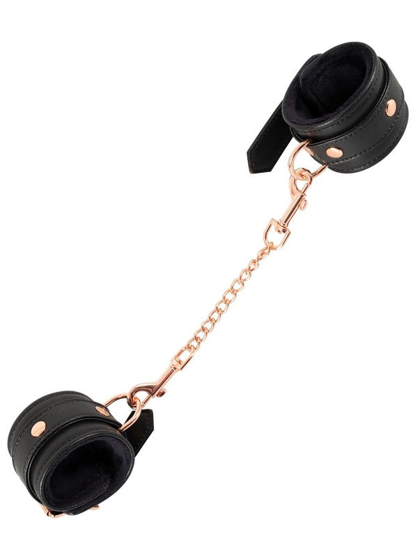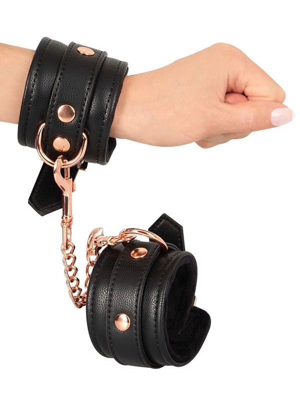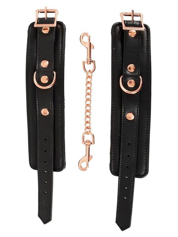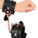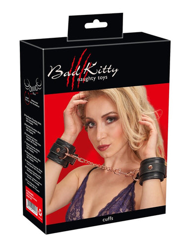 Cătușe robuste pentru mâini create de Bad Kitty într-un design elegant din piele ecologică, cu un lanț de conectare și detalii metalice de culoare rose-gold. Cătușele sunt ușor căptușite cu un interior de plușat. Fiecare manșetă dispune de un inel D ce permite atașarea ușoară a lanțului de conectare inclus.