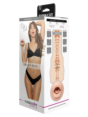 Pentru toate fanteziile tale cu Riley „orientate spre oral”, gura Riley Reid este adiția perfectă la colecția ta Fleshlight Girl. Alunecați ușor în interiorul manșonului mătăsos și neted al gurii Riley. În interior, textura numită pe bună dreptate „Insomnia” vă va ține cu siguranță „treaz” toată noaptea... așa că nu uitați să lubrifiați corespunzător!