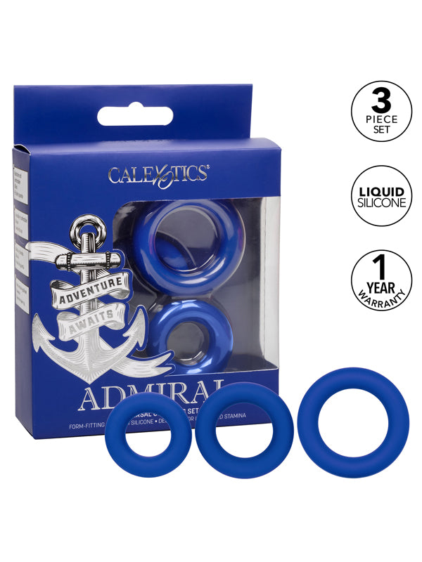 Setul CalExotics Admiral este compus din 3 inele din silicon lichid ce cresc treptat în dimensiune. Aceste inele extra-confortabile sunt concepute pentru a crește rezistența, a îmbunătăți sensibilitatea și a oferi un suport palpitant pentru erecție. Folosiți inelele individual sau combinați-le pentru o stimulare suplimentară.