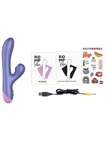 - Include: ROMP Pulse, Ghid de pornire rapidă, Instrucțiuni de siguranță, Autocolante, Cablu de încărcare USB (adaptorul AC nu este inclus)